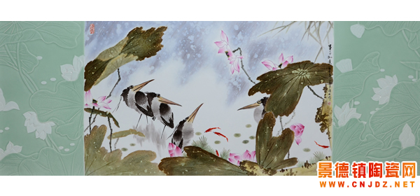 當(dāng)然如果你僅僅以為徐斌的藝術(shù)特色只是停留在運(yùn)用各種陶瓷工藝來表現(xiàn)他的藝術(shù)理念那你就錯(cuò)了!徐斌在研習(xí)各種陶瓷技藝的同時(shí)從未放下對陶瓷繪畫技術(shù)的追求和攀登。這位畢業(yè)于景德鎮(zhèn)高專美術(shù)系的才子,自幼酷愛國畫。尤喜任伯年、潘天壽等大家的作品。因此你在他的作品中總能感受到濃濃的國畫韻味。他的作品以簡筆大寫意為主,但又似寫非寫,在寫意中見工筆。比如他畫的荷花,荷葉是寫意的,鷺鷥和荷花是半工筆的,這使得他的作品獲得一種意中見工、寓工于意的特別意趣。