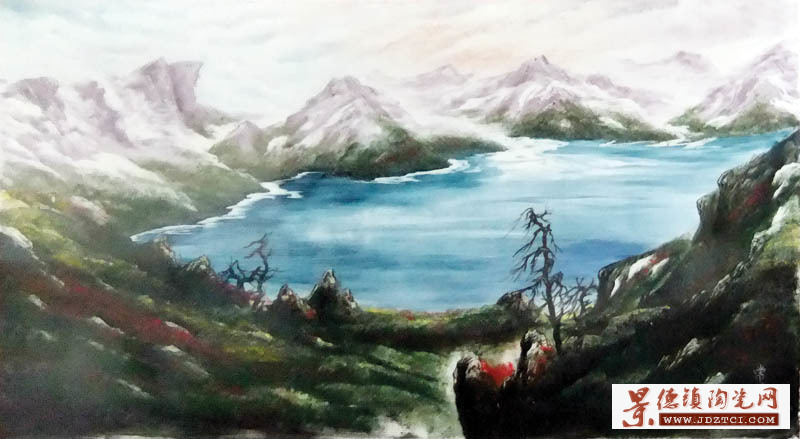 常炳華先生將西方油畫色彩在"油彩瓷畫"上的大膽運用,給傳統(tǒng)的陶瓷繪畫藝術(shù)注入了一股清新之風。在常炳華的"油彩瓷畫"中,色彩是其作品畫面的重要形成因素,他用釉色營造西方油畫當中的強調(diào)的"光",他用"光"營造他的油彩瓷畫畫面的視覺中心, 由"光"產(chǎn)生影而顯出畫面的明暗、遠近的空間透視。濃艷厚重的、高純度的暗黑、大紅、深綠、湛藍大面積地鋪墊,在灰白、淺藍、淡黃、純白等色調(diào)的襯托下,顯示出色彩驚心動魄的巨大力量;色彩塊面之間天衣無縫的銜接,遠山近水、綠樹碧草的蕩氣回腸渲染,使得常炳華的"油彩瓷畫",既具有西方油畫的形式語言,更具中國傳統(tǒng)山水畫的意境;色彩在常炳華的油彩瓷畫里表現(xiàn)得如星光一樣燦爛輝煌。他毫不夸張地說是控制色彩對比與和諧的藝術(shù)大師!堕L白山下》是常炳華先生油彩瓷畫系列里的其中一幅作品,遠處淡藍的天空和皚皚雪山成為整個畫面悠遠寧靜的背景,大面積的深綠形成了畫面的主調(diào),檸檬黃的小色塊分布其間,白色與深藍似河流曲折蜿蜒而下,夾雜著血一樣的紅色塊區(qū)域蔓延著侵蝕那純凈的藍色和幽綠色,廣袤的原野上矗立的冷杉是生命激情的體現(xiàn),令人產(chǎn)生無限意境的聯(lián)想。
