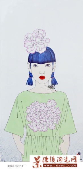 《胭脂》系列有著“洛麗塔式”調(diào)皮可愛,但她們絕不像洛麗塔那般悲催,因為,她們眼神里除了幾分憂傷之外,更多的是堅定,走向成人世界勇氣。(摘自景德鎮(zhèn)廣播電視報社 邵文艷/文)