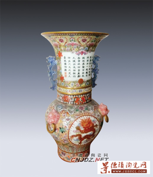 余勁松認為:好的作品就是孤品、絕品,是不能復制的永久的經(jīng)典。此件《九五之尊》作品是150件吉祥圖案冬瓜瓶,它上面頸口用龜景重工結(jié)果裝飾,瓶頸有“福祿壽”三多圖案,寓意多子、多福、多壽。里面用傳統(tǒng)“萬字頸”鑲嵌而成。瓶肩采用五鳳穿萬花,由赤金描繪而成。瓶的主題就是“九龍”,九龍穿花,由西蕃洋蓮穿插,顯示出富麗堂皇、氣宇軒然的皇家氣派。底色之上由鳳尾草鑲嵌而成,也就是在顏色上面再次結(jié)果,這種重彩裝飾燒成風險很大,但最終這件作品還是以其完美無瑕展現(xiàn)在世人面前。這是余勁松一輩子的心血之作,這件作品對他來說已經(jīng)不可復制。毫不夸張地說,這件作品從傳統(tǒng)文化著手,以中國傳統(tǒng)龍鳳圖案為設(shè)計亮點,運用現(xiàn)代陶瓷各種工藝表現(xiàn)手法,民族特色和原創(chuàng)成為這件作品真正的生命力和原動力,在傳統(tǒng)古典陶瓷藝術(shù)史上也屬于一件傳世之作、稀世珍品。