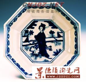 隆慶一朝時間較短,景德鎮(zhèn)窯瓷器遺留傳世的器物并不多,以小件器為主,少見大器,胎、釉較細膩。青料用回青,呈色穩(wěn)定、純正,藍中泛紫,但不像嘉靖器般紫得厲害。紋飾與嘉靖朝相近,佛道內(nèi)容較多。多六角、八角等造型。帶年款的器物甚少,官窯器的款識有“大明隆慶年造”和“隆慶年造”兩種,不見“制”字款;民窯器款有“隆慶年造”或“制”四字款;吉語和贊頌語款有“萬福攸同”、“福壽康寧”、“富貴佳器”等。因此,這件帶年款的八角盤雖為民窯器,但也彌足珍貴。