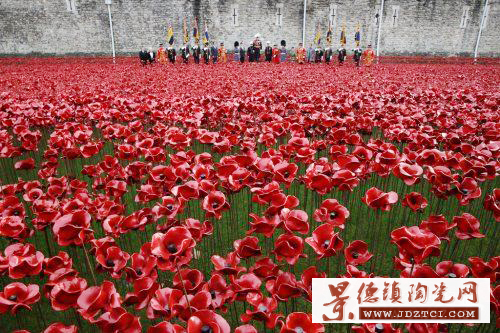 倫敦塔護(hù)城河中這一名為“血染的土地紅色的!钡难b置藝術(shù),是為紀(jì)念888246名在第一次世界大戰(zhàn)中陣亡的英國和前英殖民地將士。這些陶瓷罌粟在11月12日,一戰(zhàn)百年紀(jì)念日后第二天開始拆除并售出。