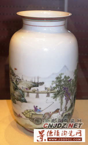 這件瓷瓶所繪“送公糧”圖,展現(xiàn)的正是那個(gè)時(shí)代農(nóng)民們趕送公糧的情景。作品繪于1955年元月,通景描繪了從四面八方紛紛趕來送公糧的農(nóng)民們,雖然載運(yùn)的形式多種多樣,有挑擔(dān)的,趕車的,船運(yùn)的,驢馱的……但大家都興高采烈,熱情高漲,積極踴躍。畫面既清新活潑,又富有情趣。瓷瓶腹部墨書題“一九五五年元月,熊曉峰作于美術(shù)合作社”。熊曉峰(1914~1996年),號(hào)醉翁、酒癡、竹影軒,江西南昌人。12歲拜師學(xué)習(xí)書畫,后得益于傅抱石大師的指導(dǎo)和傳授。該作品風(fēng)格寫實(shí),筆法細(xì)膩,色調(diào)淡雅,內(nèi)涵豐富,具有濃郁的生活氣息與鮮明的時(shí)代特色。