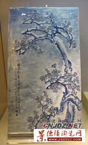 這件青花釉里紅瓷板畫是王步大師晚年力作。王步(1898~1968年),字仁元,號(hào)竹溪、陶青老人,江西豐城人。他運(yùn)用有別于傳統(tǒng)青花“雙鉤分水法”的“分水寫意法”,創(chuàng)造了青花瓷繪藝術(shù)的新高峰。他曾在文章中論述:先混水后勾線,畫者可以揮灑自如,不受限制,畫出來的畫活潑生動(dòng),線條也清爽。王步的成就一直受到有關(guān)部門的器重,先后被吸收為中國美術(shù)家協(xié)會(huì)會(huì)員、江西省美協(xié)理事、景德鎮(zhèn)市美協(xié)副主席、景德鎮(zhèn)市政協(xié)常務(wù)委員等,被譽(yù)為當(dāng)代“青花大王”。該作品運(yùn)用了中國畫的表現(xiàn)手法,以濃重青料繪老樹梅枝,虬曲蒼勁,變化多姿;以淺淡青料渲染漫天飛雪,層次豐富,意境深遠(yuǎn);以釉里紅繪梅花,豐姿綽約,紅艷欲滴。青花和釉里紅的燒制難度很大,如此青、紅發(fā)色均艷麗完美者十分難得。留白處題寫草書款:“梅花歡喜漫天雪,凍死蒼蠅未足奇。一九六四年陶青老人竹溪王步寫意”,畫青花“竹溪”“王步”二方章。
