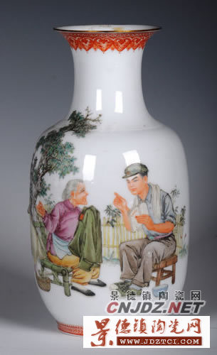 這件瓷瓶所繪畫面以籬笆院為背景,描繪了軍民互助的感人場面。庭院里,一名中國人民解放軍戰(zhàn)士拿著毛主席語錄,正在講給老奶奶聽,老奶奶則一邊聽著一邊縫補軍服,表現(xiàn)了人民軍隊植根于人民之中,軍民親如一家的密切關(guān)系。