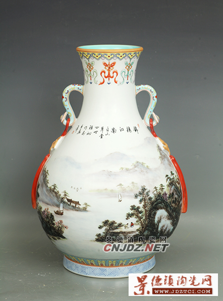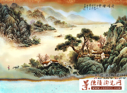汪野亭以青綠山水影響巨大。以國畫融入陶瓷中,這在山水題材上難度更大,因?yàn)橛粤显?a href="http://m.cambodiaguides.com" target="_blank">陶瓷繪畫中不像水墨在宣紙上那樣容易揮寫皴染,這就限制了瓷上山水的表現(xiàn)形式。汪野亭先生開拓創(chuàng)新,別開生面地將國畫山水繪畫的神韻融入陶瓷創(chuàng)作中,使瓷山水達(dá)到一個新的高度。在結(jié)合的過程中,不僅對景德鎮(zhèn)傳統(tǒng)的彩繪工藝進(jìn)行了一系列的改革,而且也對傳統(tǒng)“文人畫”作了一些內(nèi)容和形式上的調(diào)整。