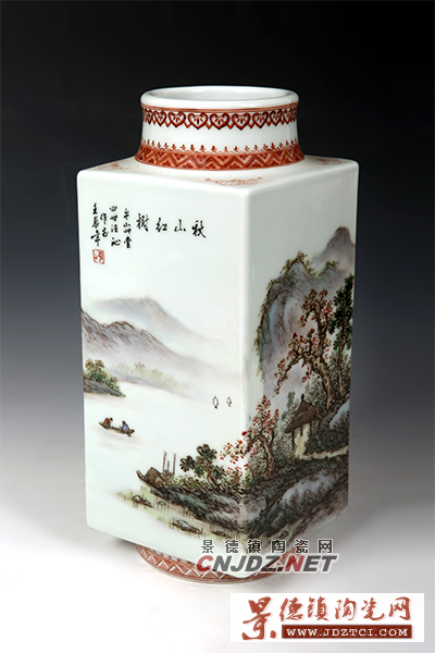 縱觀幾代“汪派山水”,不難發(fā)現(xiàn)“汪派山水”繼承了中國傳統(tǒng)文人畫中的品位。講究融詩、書、畫于一體,由作者本人書畫并題。作品意境深遠(yuǎn),色彩淡雅,以景傳情,具有強(qiáng)烈的感染力。因此能表現(xiàn)作者主觀思想志趣與審美觀念,突出個人的創(chuàng)作風(fēng)格與個性。也能體現(xiàn)作者的文化藝術(shù)修養(yǎng)和哲學(xué)思想。山水創(chuàng)作將國畫的皴、擦、暈、染等技法融入瓷畫創(chuàng)作,通過陶瓷這個載體表現(xiàn)個人思想情感和審美旨趣,這完全有別于傳統(tǒng)山水的勾線填色和富麗重彩,而顯得清雅脫俗,個性風(fēng)格突出,使作品有很高的文化內(nèi)涵和藝術(shù)價值,這是以往景德鎮(zhèn)的傳統(tǒng)彩繪藝人所不具有的。在造型藝術(shù)方面,適應(yīng)陶瓷花瓶等圓形器皿彎曲轉(zhuǎn)折的特點(diǎn),巧妙布局,別具匠心地始創(chuàng)難度很高的通景山水,使陶瓷作品在各個角度看都是完整的畫面,又可以連續(xù)轉(zhuǎn)動觀賞,將國畫山水長卷的神韻融入其中,而陶瓷造型特色,又使之具有首尾相連,循環(huán)往復(fù)的動態(tài)美。在設(shè)色方面,既不同于古彩的單調(diào)、刻板、艷俗,又比淺絳彩豐富,富于表現(xiàn)力。