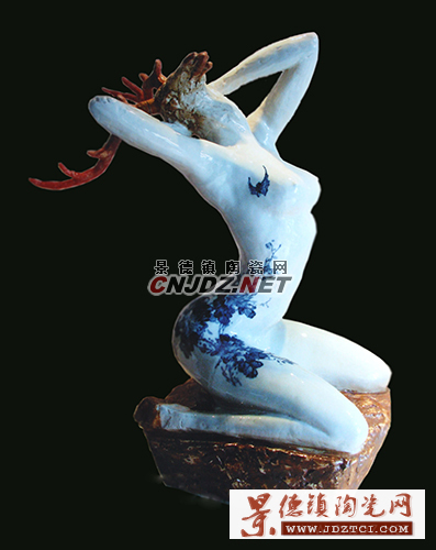 這種人神合一的形象給了趙坤巨大的震撼,她開始嘗試用簡練的雕塑語言表現(xiàn)這個動人的意象,雕塑的主體是少女美麗的裸體,而少女的頭則用各種動物的頭直接裝飾:美麗的鹿角、雄性的豹頭、閃著寒光的狼首。在裝飾手法上,趙坤也開始向傳統(tǒng)學(xué)習(xí),大量運用了景德鎮(zhèn)原素,青花、粉彩繪出的圖案美侖美奐,表現(xiàn)出一種極具張力的美感。