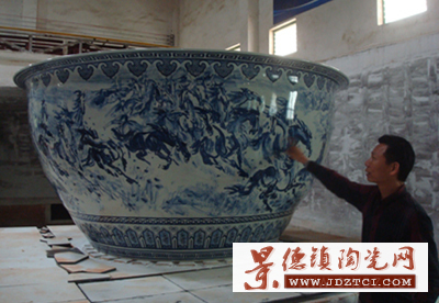 近日,記者在黃玉明的創(chuàng)作基地,見(jiàn)到了這個(gè)巨型瓷碗。青花瓷碗采用手繪釉下燒制工藝,以駿馬為元素,展現(xiàn)一幅萬(wàn)馬奔騰、氣勢(shì)如虹的圖景。整個(gè)瓷碗要四五個(gè)成年人才能環(huán)抱住。