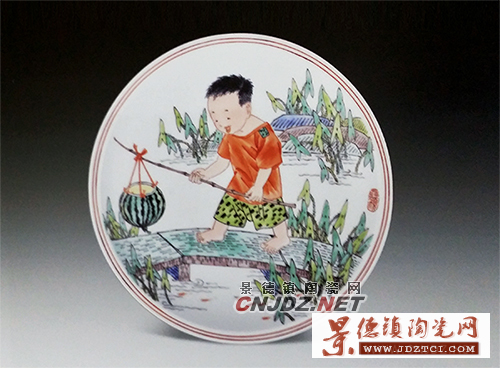 說起來,這里面有一個(gè)機(jī)緣。十997年,李磊穎身懷六甲,那時(shí)候她便提前回到了浙江老家待產(chǎn)。在老家呆著的那段時(shí)間,李磊穎也沒閑著,她每天悠閑地畫起了國畫,一個(gè)個(gè)可愛的童子形象在她筆底出現(xiàn)了,所有的對(duì)新生命的期待和母性的關(guān)愛都傾注在了她的筆端,慢慢地積累了一百多張國畫。后來回景德鎮(zhèn)后,這批在老家畫的嬰戲題材的手稿也被帶了回來,從此,帶滿滿真情的李磊穎開啟了她的瓷上嬰戲題材的創(chuàng)作。