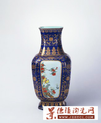 霽藍(lán)釉描金地開(kāi)光粉彩花鳥(niǎo)紋方瓶,清乾隆,現(xiàn)藏于北京故宮博物院霽藍(lán)釉描金地開(kāi)光粉彩花鳥(niǎo)紋方瓶,清乾隆,現(xiàn)藏于北京故宮博物院
