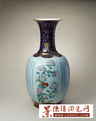 霽藍(lán)地描金粉彩詩(shī)句花卉紋大瓶,清乾隆,現(xiàn)藏于北京故宮博物院霽藍(lán)地描金粉彩詩(shī)句花卉紋大瓶,清乾隆,現(xiàn)藏于北京故宮博物院