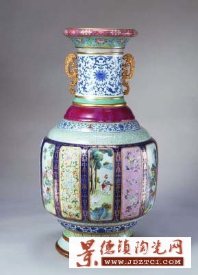 清代乾隆時(shí)期歷時(shí)60年,是封建社會(huì)發(fā)展的太平盛世。此時(shí),由于乾隆皇帝嗜古成癖,對(duì)瓷器情有所鐘,再加之督陶官唐英對(duì)景德鎮(zhèn)御窯廠(chǎng)的苦心經(jīng)營(yíng),一大批身懷絕技的名工巧匠匯集于景德鎮(zhèn),致使御窯廠(chǎng)的瓷器生產(chǎn)無(wú)論在數(shù)量還是質(zhì)量上都達(dá)到前所未有的境界。特別是各種新奇淫巧的制品層出不窮,其工藝技術(shù)之高可謂鬼斧神工。這件各種釉彩大瓶,集各種高溫、低溫釉、彩于一身,素有“瓷母”之美稱(chēng),集中體現(xiàn)了當(dāng)時(shí)高超的制瓷技藝,傳世僅此一件,彌足珍貴。
