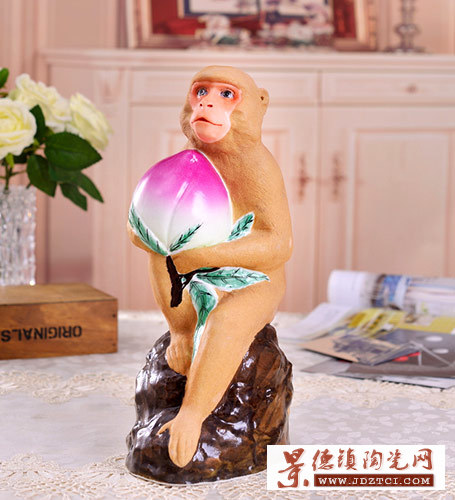 其一,猴子獻桃象征長壽。這件“金猴獻壽”是景德鎮(zhèn)工藝大師張育賢的作品。作品中一只靈猴身坐仙山福地上,手捧著鮮艷無比、碩大水靈、香氣馥郁的仙桃。桃為五木之精,傳說仙境中生長的桃樹,三千年一結果,結出仙桃是增壽的瑞果。此件器物釉色恰到好處地表現(xiàn)出猴子身上的茸毛以及炯炯有神的目光。作品栩栩如生、動感十足,以寫實造型手法賦予了靈猴深邃的文化底蘊和現(xiàn)代瓷雕藝術的審美價值,以全新的陶瓷藝術語言表達了“新春納福、金猴獻壽”的吉祥祝福。