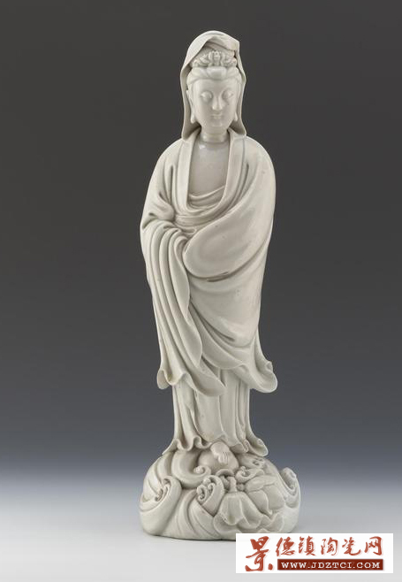 上海博物館收藏的明德化窯白釉“何朝宗”款觀音像(如上圖所示),高48厘米。觀音頭挽高髻,披帔巾,面部豐滿圓潤(rùn),目光向下,表情柔和,體態(tài) 豐腴,頸戴項(xiàng)圈,上著袒胸廣袖褒衣,下著寬腿長(zhǎng)褲,兩手相拱互置袖中,赤足,立于水波蓮花上。衣褶線條柔潤(rùn),頭發(fā)絲絲畢現(xiàn),刻畫(huà)精細(xì),含蓄端莊,溫順靜 雅,栩栩如生。背面隱隱約約鐫刻有“何朝宗印”。