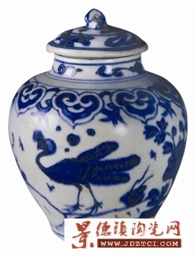 罐通高14.1厘米,口徑5.2厘米,足徑6.1厘米;呈瘦長形,蓋鈕為一蛇形雕塑體,造型秀美。底署青花單框吉語款。肩部如意紋之間,飾有環(huán)狀連接物及三枚小葉。這類裝飾,在正德時是沒有的,為嘉靖時期的紋飾特征。青花呈色濃艷微紫,系采用上好回青中加石子青的混合料。