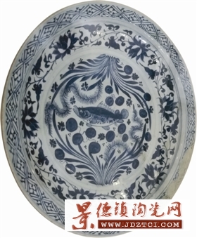 在二樓的古陶瓷館,筆者欣喜地發(fā)現(xiàn)館內(nèi)中國古陶瓷器陳列了滿滿當(dāng)當(dāng),從高古瓷、陶器至明清出口瓷、克拉克瓷等應(yīng)有盡有,尤其令人震驚的是二樓陳列室中央,赫然安放了三件元青花大盤,每件大盤的直徑均達(dá)四十多厘米。三件大盤名稱分別為藍(lán)地白花云肩鳳紋花口盤、花果飛鳳紋菱口折沿盤、鱖魚水藻紋大盤。三件元青花大盤,氣勢(shì)恢宏,光彩奪目。