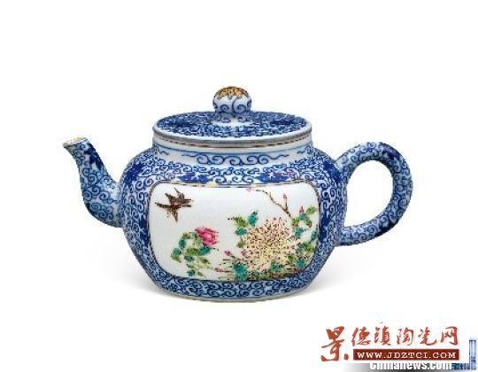 清乾隆粉彩青花開光花鳥紋描金茶壺