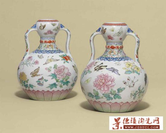 5月9日,一對乾隆御制粉彩花蝶紋如意耳葫蘆尊以咨詢價上拍倫敦佳士得,以1472.5萬英鎊成交,約合人民幣1.31億元。而此前,它們的估價僅在1000英鎊(約合人民幣9000元)以下,花瓶的主人之前并沒有在意它的價值,表示最初只是被擺放在壁爐上的裝飾品,是19世紀30年代時她的親戚收購得來的。