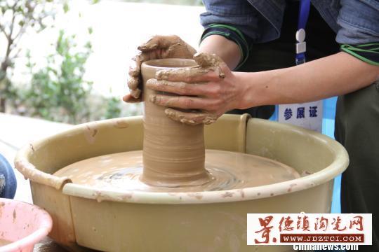 記者在現(xiàn)場看到,來自阜陽科技工程學(xué)校的學(xué)生們,正在現(xiàn)場展示彩陶的制作技藝之一——拉坯,一團(tuán)專用的黃膠泥在徐徐旋轉(zhuǎn)的工作臺上,經(jīng)巧手輕輕揉捏,不一會(huì)便形成了一只線條流暢的瓶身。