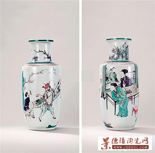 “清康熙 五彩人物故事紋棒槌瓶”2011年在北京保利以126萬元成交。所謂“青花則取其沈靜。五彩則喜其豪宕!薄短昭拧吩u點(diǎn)康熙五彩更以“奇詭”二字形容,與此器吻合。此康熙棒槌瓶所繪為月下人物聽曲,一人擊板,一人持戟表演,神情動(dòng)作均極“豪宕”,旁有夫妻二人賞戲,果饌羅列,美酒佳肴,然樂而忘食,神情專注,故曰康熙五彩“所畫人物,每詼詭可怖,怪怪奇奇,千態(tài)萬狀,余不諳戲曲,不能名其妙”?滴跷宀手,有待方家細(xì)細(xì)品味。