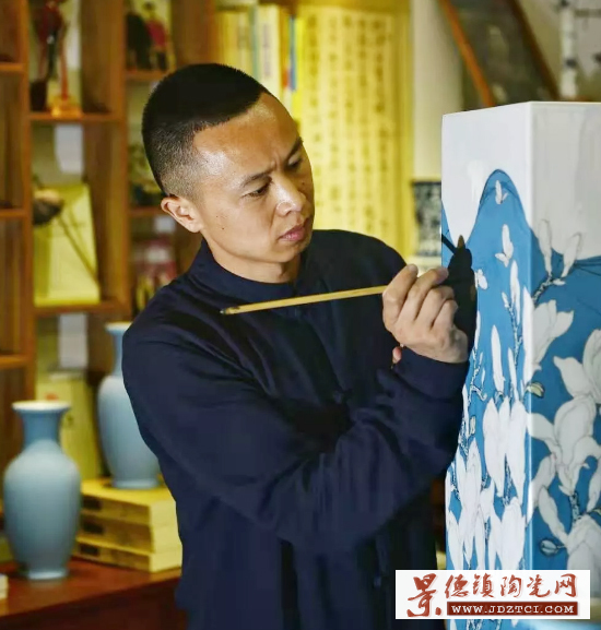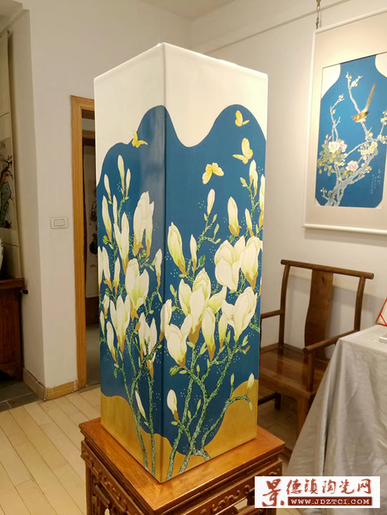 作品“入神、入心、入言”,以五行、生態(tài)、中國夢為內(nèi)核,在傳統(tǒng)元素中創(chuàng)新方法,高白泥制胎,綜合運(yùn)用古彩、粉彩等工藝技法繪制。潔白的玉蘭花冠幽靜典雅,花蕊以極富質(zhì)感的寶石紅點染,玉蘭花萼和花托以及鑲器下部的沙丘印象都用24K純金描繪,使畫面更加富麗大氣。畫面中古綠、蘋果綠、天藍(lán)等溫和色彩構(gòu)成大自然中的生態(tài)景象,在色彩的層次感方面處理得非常細(xì)膩而微妙,作品問世后,各界反響強(qiáng)烈。