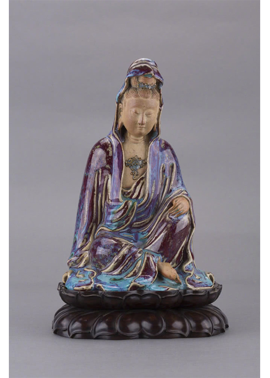 這件就是馬未都馬爺收藏的一尊雍正年間的觀音瓷塑,這件瓷塑據(jù)馬未都在收藏馬未都節(jié)目當中的介紹,我們可以得知,這件觀音瓷塑身披窯變,而恰恰就是這個窯變讓這尊觀音增加了神秘感,這是雍正時期的窯變,這個時期的窯變從顏色到觀音的姿態(tài),讓人感受到一種富麗堂皇的感覺,窯變呈現(xiàn)出一種紅藍相間的抽象對比色,觀之讓人很快進入一種奇幻的世界,馬未都在節(jié)目中透露,紅藍相間是雍正年間窯變瓷器的標準的鑒定方法,馬爺直言清代早期的佛造像有當年宋金時期的味道,面部比較豐滿并且比較鼓,眉毛和眼睛之間比較緊湊,表情像是在思考,此尊觀音整體感覺非常安靜,身體也非常放松,衣著也非常松弛,馬爺這件觀音瓷塑表達了自在觀音的基本形態(tài),馬爺還拿出了一個手電,按照一個有規(guī)律的軌跡從不同的角度照射觀音時,發(fā)現(xiàn)觀音的面部出現(xiàn)了不同的變化,由沉穆變成笑意滿臉,觀眾看后恍然大悟,十分神奇。