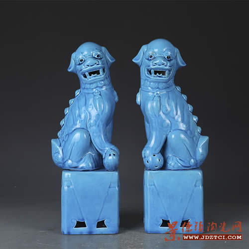 早期有收藏的孔雀藍(lán)(法藍(lán)、法翠)釉獅子主要是案頭清供擺件,民國(guó)時(shí)期的孔雀藍(lán)釉獅子是達(dá)官顯貴文案廳堂陳設(shè)珍品,民國(guó)時(shí)期這樣的瓷獅子,有時(shí)候瞧瞧不像獅子,倒有點(diǎn)像獅子狗,如果有一件瓷獅子年份能達(dá)到民國(guó)時(shí)期的,估價(jià)都至少幾千元到幾萬(wàn)元。還根據(jù)尺寸不同,價(jià)格也不同。解放后六七八十年代景德鎮(zhèn)生產(chǎn)孔雀藍(lán)釉陶瓷獅子,大多數(shù)是景德鎮(zhèn)藝術(shù)瓷廠出品的老廠貨。