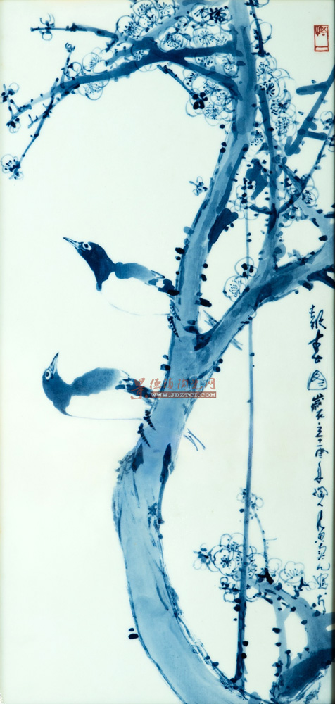 黃賣九的青花瓷板畫《報(bào)春圖》堪稱傳統(tǒng)工藝與現(xiàn)代藝術(shù)語言融合的典范之作。這件作品以青花分水技法為核心,突破傳統(tǒng)程式化表現(xiàn),通過極具實(shí)驗(yàn)性的潑墨寫意手法重構(gòu)了陶瓷繪畫的視覺體系,在材質(zhì)特性與藝術(shù)表達(dá)之間找到了精妙的平衡點(diǎn)。