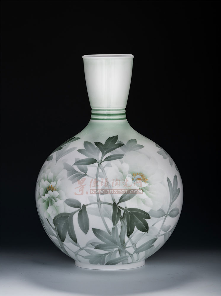 器形與紋飾的呼應(yīng):作品采用天球瓶造型(源自明代永宣官窯,象征“天圓地方”的宇宙觀),圓潤(rùn)飽滿的瓶身與舒展靈動(dòng)的葉片、嫵媚的牡丹相得益彰,瓶頸處刻三環(huán)紋飾,既簡(jiǎn)潔秀雅,又暗含“天地人”三才的哲學(xué)意蘊(yùn)。