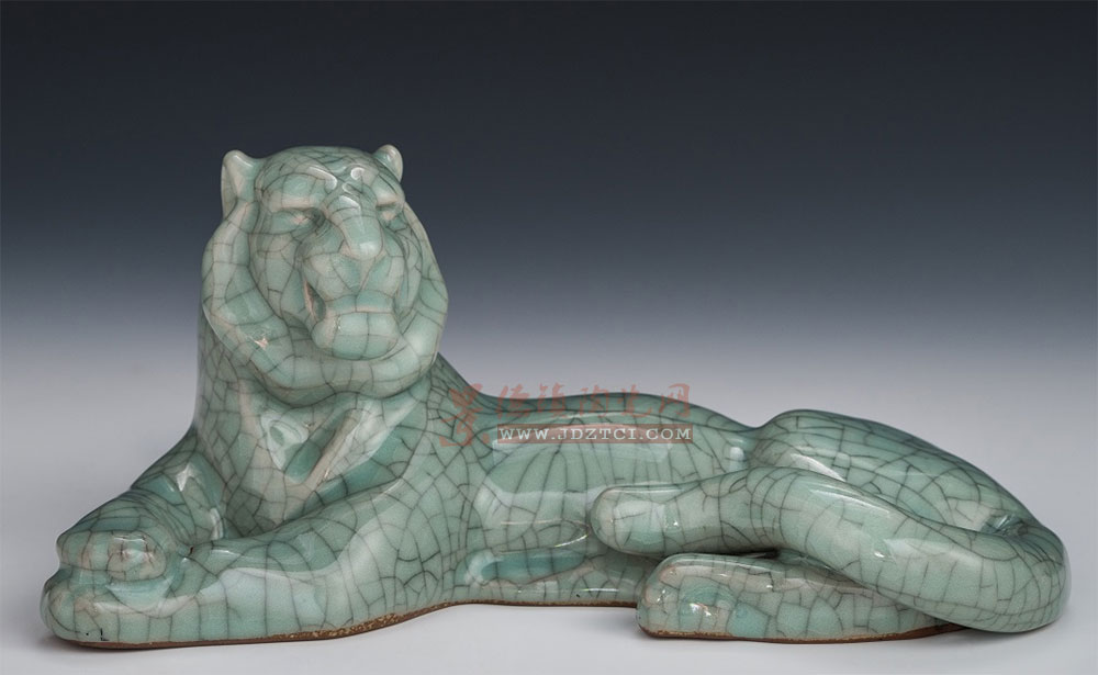 南宋官窯以“粉青”“月白”等釉色聞名,追求玉的溫潤質感。郭琳山通過精準的釉料配比與燒制控溫,復現了南宋官窯“類玉非玉而勝玉”的釉面效果,賦予老虎軀體以含蓄內斂的光澤。